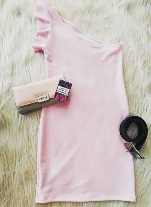 Vestido soft, corto, una manga con volados. Talle 1, color rosa